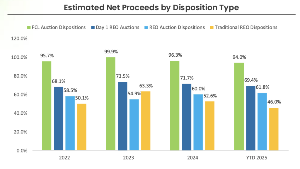According to Auction.com’s 2025 Disposition Strategy Report (DSR), average REO inventory increased to 897 days for traditional sales compared to just 320 days for REO auctions, while auction-first, earlier dispositions produced a record 43 percentage-point net-proceeds advantage over traditional REO through Q3 2025.