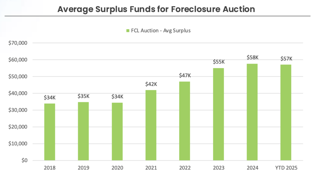 Junior lien holders and distressed homeowners have access to the almost $57,000 average surplus earned by foreclosure auction sales thus far in 2025, following the payment of any junior liens.