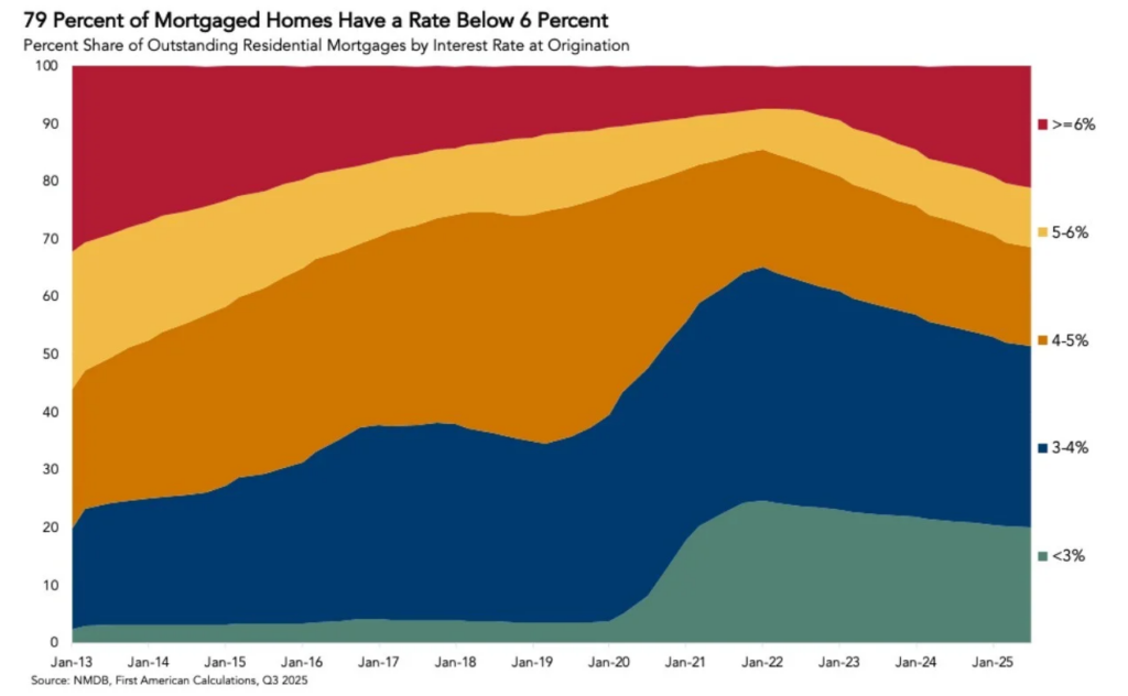 Although they are tightening, the “golden handcuffs” of cheap mortgage rates are still in place, according to Kushi. Selling frequently entails trading a low payment for a higher one—enough to keep many “optional” sellers on the sidelines and limit turnover, even as demand gradually improves—because, according to the most recent NMBD third quarter data, almost 79% of mortgaged homes still carry a rate below 6%. However, rates are not the only factor that influences home decisions.