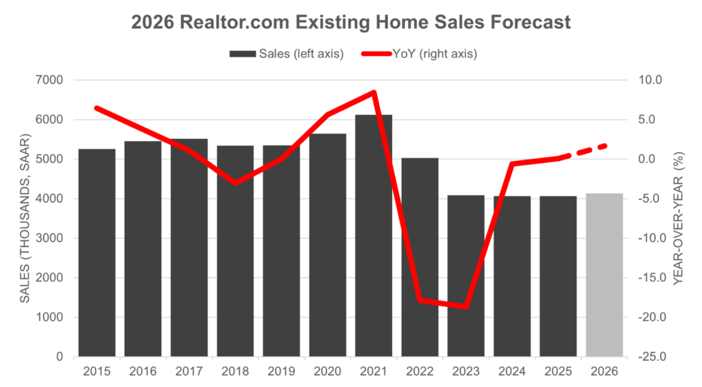 Realtor.com experts predict a more stable housing market in 2026, but it’s still early. Home prices are expected to grow slightly by 2.2% but mortgage rates are expected to average 6.3%, relieving some of the burden on affordability. Sales of existing homes should increase by almost 1.7% to 4.13 million, a modest but significant increase from the nearly 30-year low in 2025. For-sale inventory will also keep improving, rising by over 9% year-over-year.