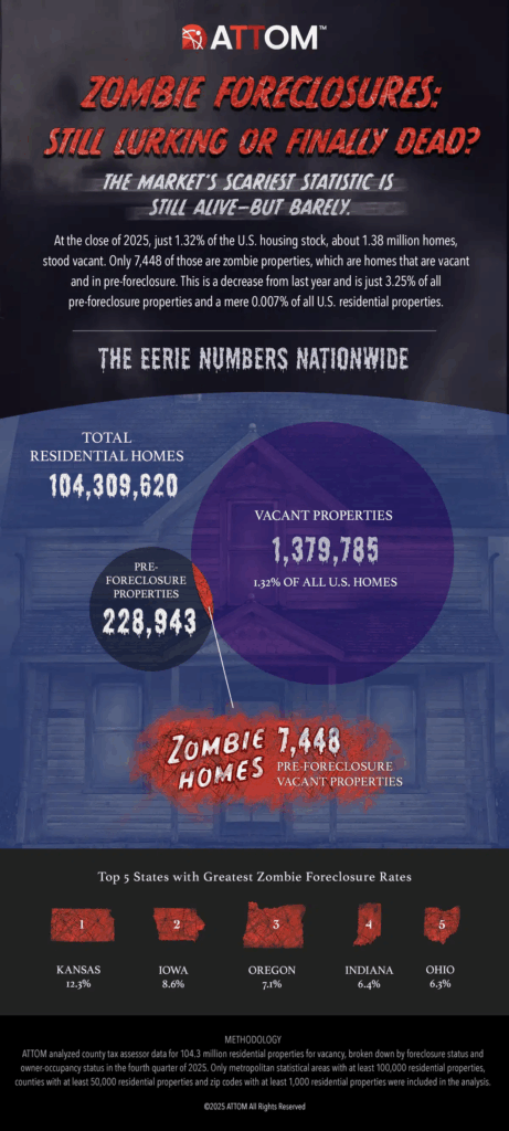 According to ATTOM’s fourth-quarter 2025 report, some 1.32% of residential properties in the United States were unoccupied, a modest decrease from 1.33% the quarter before. Additionally, the percentage of zombie foreclosures decreased somewhat, from 3.38% in Q3 to 3.25% in Q4, which equates to around 7,448 homes. Most states had a fall in zombie foreclosure and vacancy rates, with Florida, Indiana, and California seeing the biggest drops, while Ohio, Nevada, and Oregon saw just slight rises.