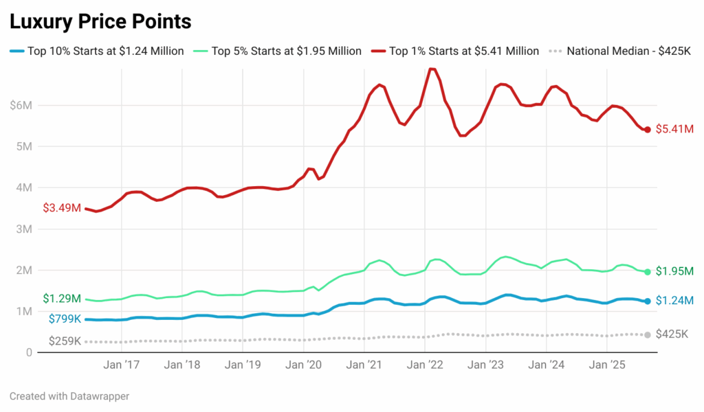 - Luxury benchmark dips slightly: The national luxury threshold (90th percentile) declined 0.5% month over month and 2.4% year over year to $1.24 million, marking a fourth consecutive month of modest softening.